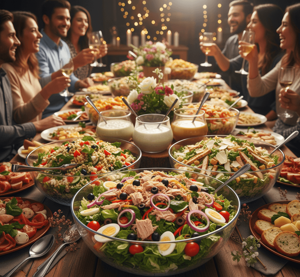 Bunte Salatschüsseln mit hausgemachten Dressings. Optional mit Hähnchen, Thunfisch oder Mozzarella – perfekt als leichte Beilage oder frische Ergänzung zum Buffet.